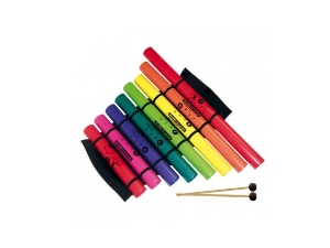En tissu avec emplacements élastiques pour insérer jusqu’à 8 tubes boomwhackers – Facile à transporter, le boomophone est livré avec 2 mailloches pour jouer comme sur un xylophone.