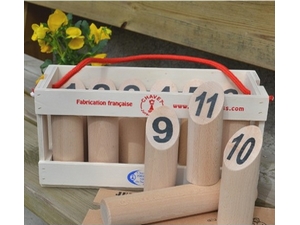 Jeu de quilles en bois originaire de Finlande. Fabrication en bois de hêtre. Le but du jeu : atteindre 50 points, en faisant tomber les quilles. Le numéro inscrit sur la quille indique le nombre de points gagnés, à condition de n’avoir couché qu’une seule quille, sinon on ne comptabilisera que la quantité de quilles couchées à raison d’1 point par quille. Il faut donc bien viser, mais aussi compter et établir la bonne stratégie pour ne pas dépasser 50 points ! Ce jeu de lancer est complet, car nécessite de l’adresse, de la tactique et fait travailler les notions de base de calcul et d’arithmétique.