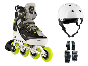 Paire de rollers réglables sur 4 tailles 38-41. Rollers faciles à mettre grâce à des serrages simples et efficaces : une boucle micrométrique sur le haut du chausson pour une meilleure précision + un scratch au niveau du cou-de-pied pour bien caler le talon dans la chaussure. Le réglage se fait en 3 étapes : 1.Ouvrir le levier. 2.Tirer sur le devant du chausson. 3.Fermer le levier. Livré avec un jeu de protections comprenant une paire de protège-poignets, une paire de genouillères et une paire de coudières avec fixations velcro ainsi qu’un casque et 1 sac de transport. N’oubliez pas de former vos élèves au soin et au rangement du matériel !