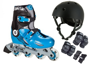 Chaussure avec une coque articulée en polyuréthane haute résistance. Système avec attaches rapides. Jeu de protections comprenant une paire de protège-poignets, une paire de genouillères et une paire de coudières avec fixations velcro ainsi qu’un casque enfant. Ensemble conditionné dans un sac de transport. Modèle réglable de la pointure 28 à 30. Taille A. N’oubliez pas de former vos élèves au soin et au rangement du matériel !