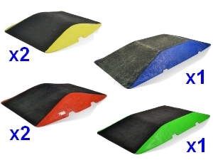 Lot de 6 obstacles pour l’acquisition des compétences du SRV (Savoir Rouler à Vélo) : 2 petites bosses, 2 bosses moyennes, 1 grande table, 1 petite table. Les éléments peuvent être utilisés pour tous les autres engins roulants : rollers, skateboard, trottinette…