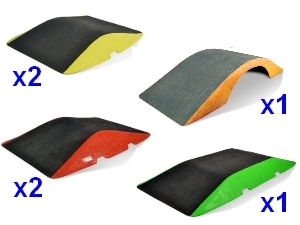Lot de 6 obstacles pour l’acquisition des compétences du SRV (Savoir Rouler à Vélo) : 2 petites bosses, 2 bosses moyennes, 1 grande bosse, 1 petite table. Les éléments peuvent être utilisés pour tous les autres engins roulants : rollers, skateboard, trottinette…