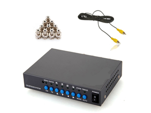 Processeur quad avec 4 canaux et une sortie vidéo VGA pour caméra vidéo. Connecte 4 caméras vidéo au maximum luminosité, contraste, saturation, teinte et acuité réglable Résolution PAL 720 Hauteur x 576 Largeur, NTSC 720 Hauteur x 480 Largeur. Taux de rafraîchissement: PAL: 25 Frames / second, NTSC 30 Frames / second Nombre de canaux 4 canaux Sortie vidéo 1 canal de sortie BNC, 1 canal de sortie VGA. Livré avec adaptateurs BNC et câbles vidéo RCA.